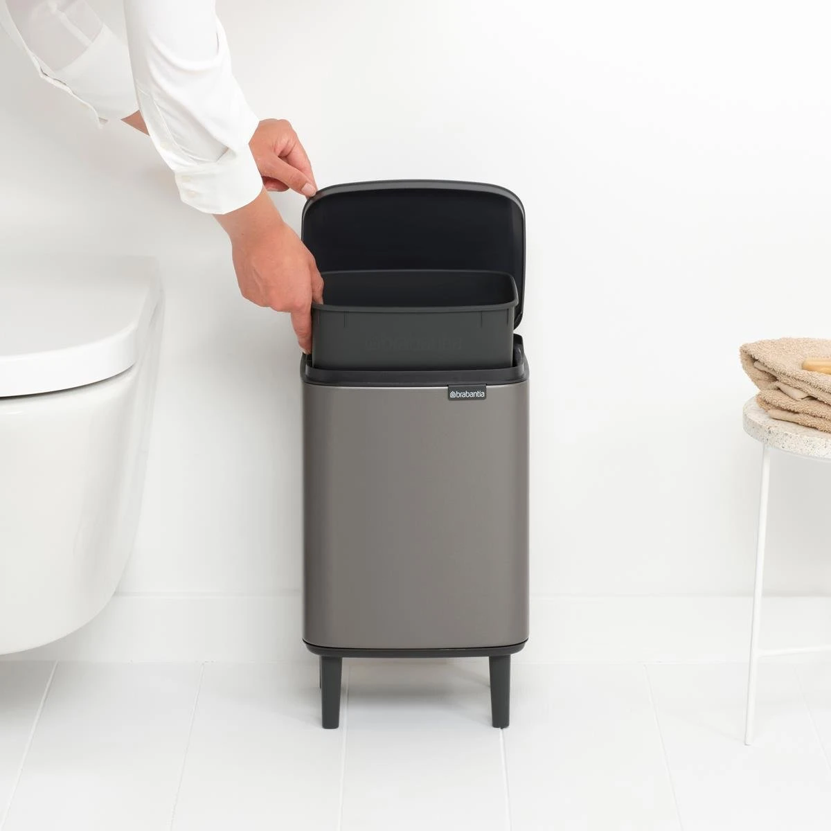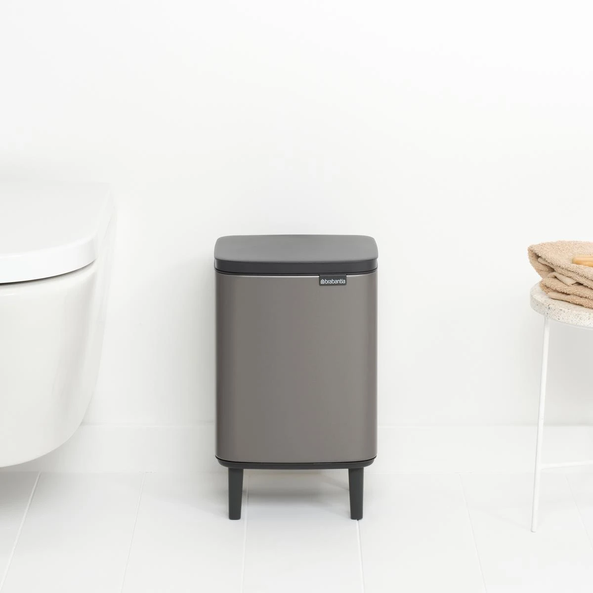 Niet te groot, niet te klein, maar precies goed. De Brabantia Bo Hi Afvalemmer is perfect voor in de badkamer. Deze chique prullenbak staat hoog op z’n pootjes. De deksel opent gemakkelijk vanaf de linker-, rechter- én voorkant. Handig!