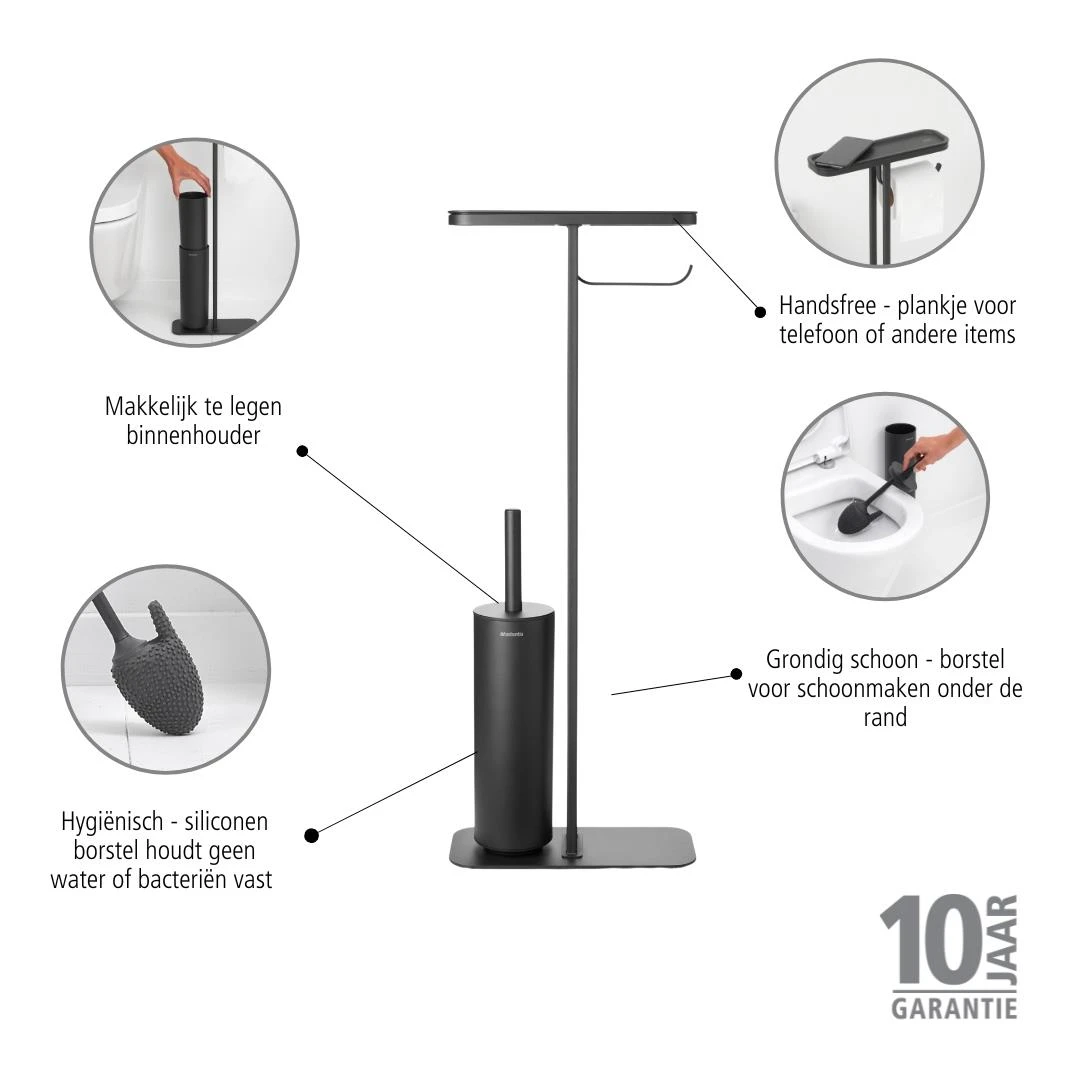 Natuurlijk wil je alles binnen handbereik in de kleinste kamer van het huis en dat is mogelijk met deze Brabantia MindSet toiletbutler. Zeker de ultieme assistent die een plek biedt aan je mobiel, een rol toiletpapier en een toiletborstel.
